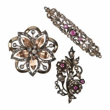 THREE GEMSET SILVER AND GOLD BROOCHES, including a foliate spray brooch set with rubies and rosecut diamonds