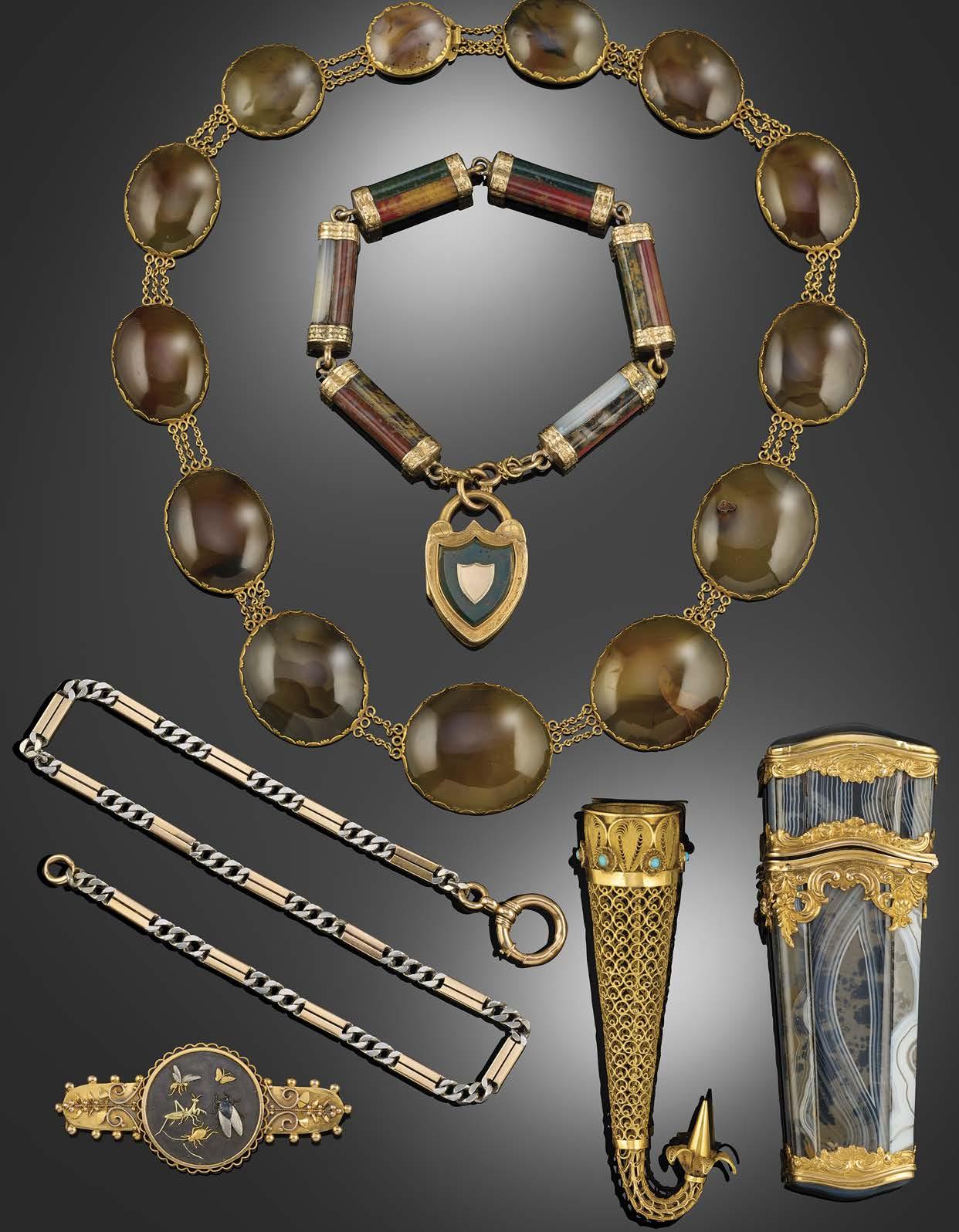 A COLLECTION OF JEWELLERY, including a gold and banded agate long chain