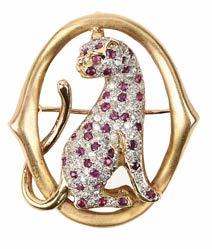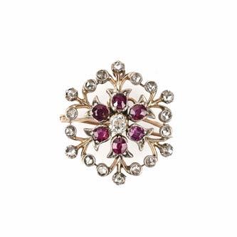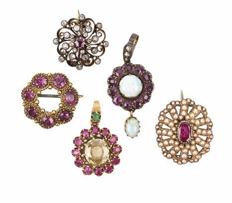 FIVE GEMSET BROOCHES OR PENDANTS, including a 19th century ruby and diamond brooch set in silver and gold