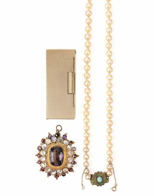 A CULTURED PEARL NECKLACE, A BROOCH AND A 9CT GOLD CIGARETTE LIGHTER, gross weight 79g