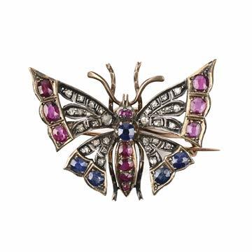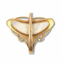 547 AN EGYPTIAN REVIVAL OPAL, DIAMOND AND ENAMEL BROOCH, MID 19TH CENTURY, designed as a winged scarab, its body composed of an oval cabochon opal set with rosecut diamonds, framed by twin gold snakes with ruby eyes, the scarab’s outstretched wings set with cushionshaped rubies and rosecut diamonds and detailed in green enamel, mounted in gold, stamped O.R.*.M. H.N.V.S, width 5cm, gross weight 8.7g £600800