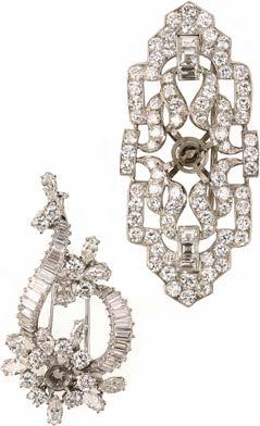 577 VAN CLEEF & ARPELS, TWO DIAMONDSET FLAME BROOCHES, C1940s, both set with interlocking bands of circularcut and baguetteshaped diamonds channelset in platinum and white gold, the larger brooch signed Van Cleef & Arpels and numbered 83688 with French control marks and maker’s lozenge for Dumont & Compagnie, length 6.7cm, the smaller brooch signed Van Cleef et Arpels and numbered 86021 with French control marks and maker’s lozenge for Dumont & Compagnie, length 5.8cm