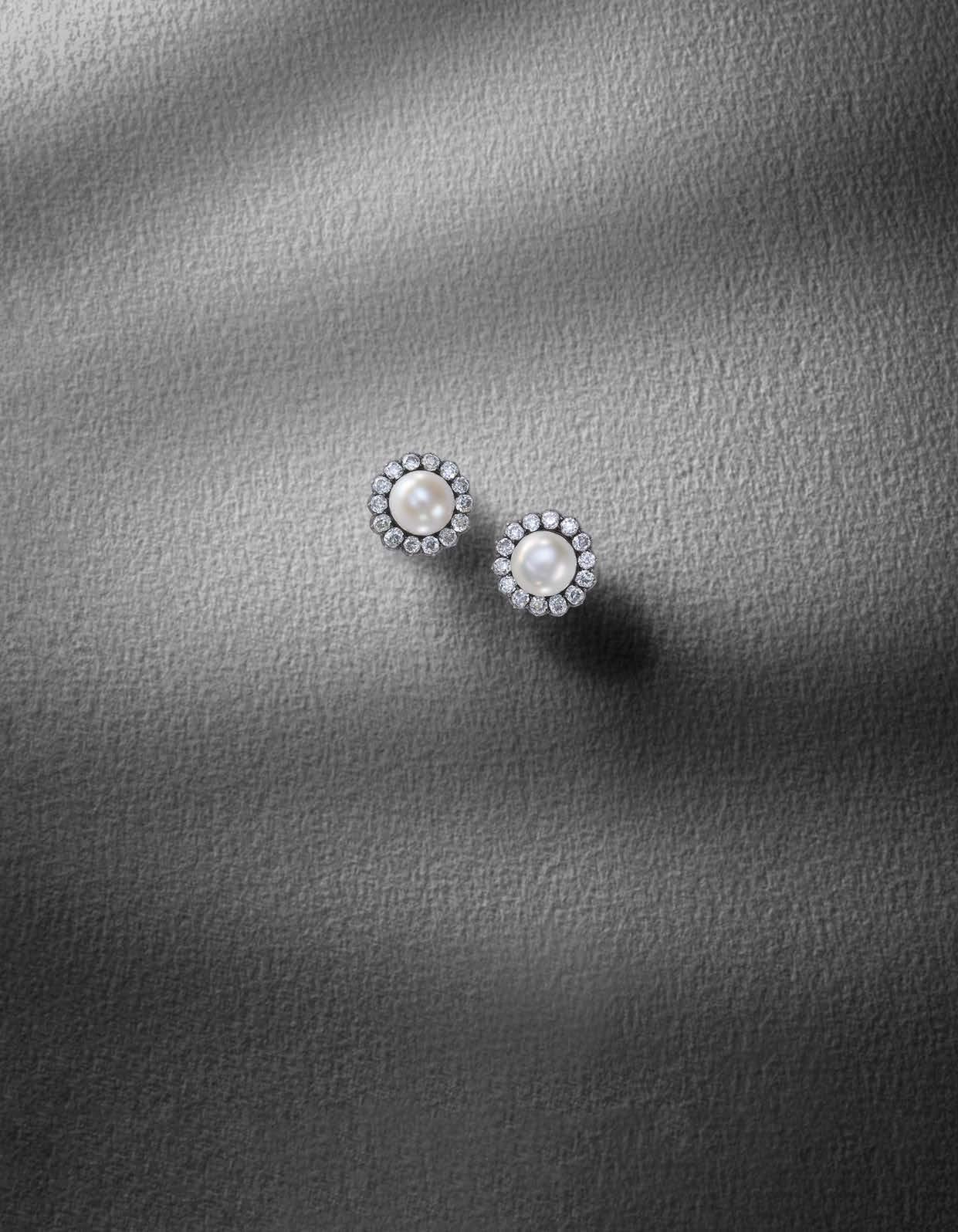 592 A PAIR OF LATE 19TH CENTURY NATURAL FRESHWATER PEARL AND DIAMOND EARRINGS, the buttonshaped pearls weighing 11.23cts and 12.02cts, and measuring approximately 12.7mm and 12.5mm and set within a surround of old cushionshaped diamonds in silver and gold, diameter 2.2cm £5,0007,000
