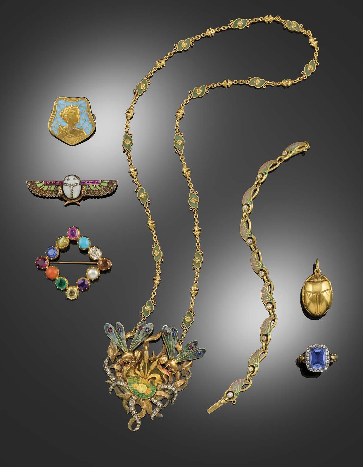 549 AN ART NOUVEAU DIAMOND, GOLD AND ENAMEL PENDANT, C1905, centred with a lily pond with bullrushes and two dragonflies to the upper section set with graduated foliage, the lily pond and dragonfly wings decorated with pliqueàjour enamel, with French control mark to upper section, length 6.3cm, to an Art Nouveau gold and enamel decorative chain, alternately mounted with inverted pairs of small flower heads and foliate scrolls, with pliqueàjour enamel decoration, length 52cm, with case, indistinctly signed silk lining and addressed to 104 Bd Sébatopol, Paris