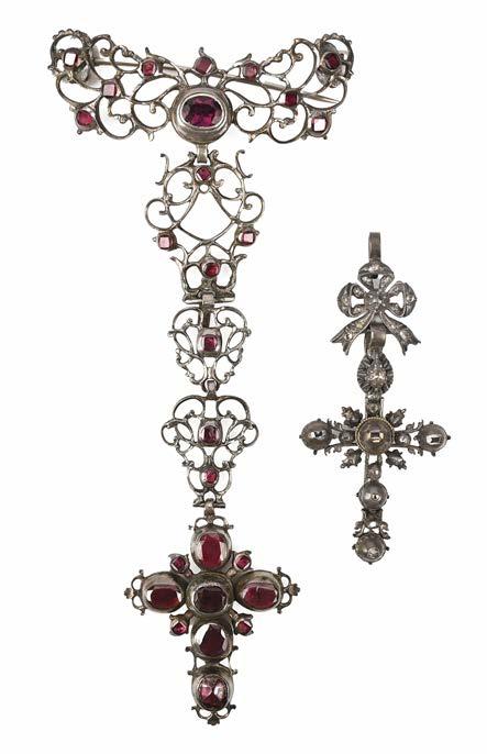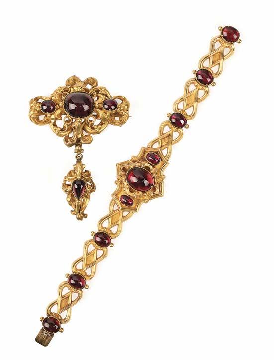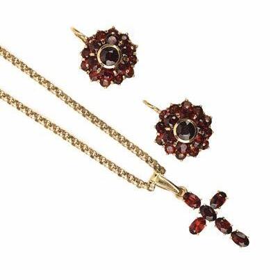 A PAIR OF GOLD EARRINGS AND A GARNET BROOCH, 19TH CENTURY AND LATER