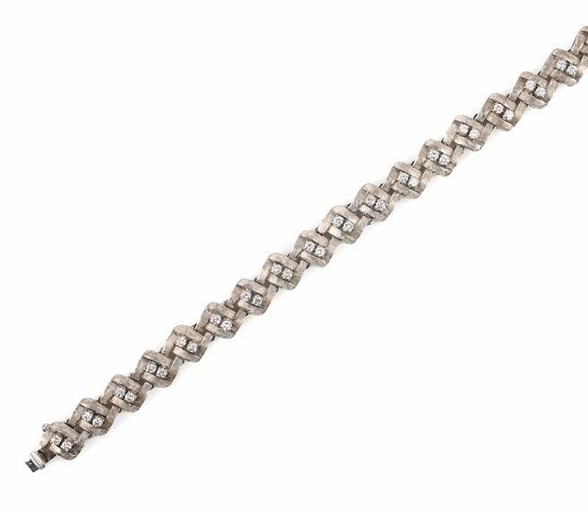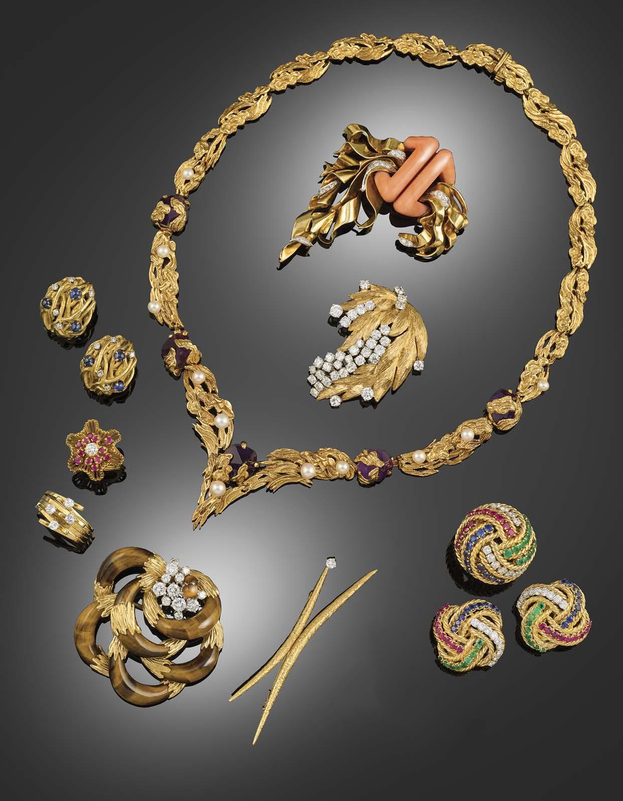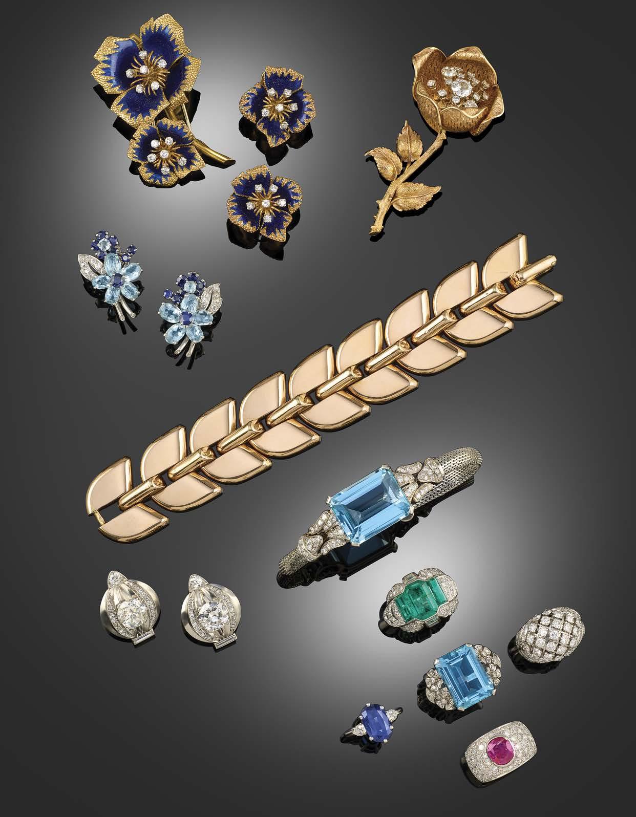Van Cleef & Arpels first introduced this new style of jewellery with the release of the 'Flamme' brooch in 1934. This design, which has now achieved iconic status in Van Cleef & Arpels' oeuvre, pioneered the shift away from the angular and more abstract geometric forms of the earlier Art Deco period. Its scrolling design, similar to a flame, from which the French name 'Flamme', introduced the taste from more organic forms and gentler curvilinear shapes that heralded the taste for the softer style of midcentury jewellery. With the 1937 Exposition Internationale des Arts et Techniques dans la Vie Moderne, this new taste for curves and arabesques was firmly established, and the tone was set for the following two decades. Skilled craftmanship was at the heart of this new style, with the large design houses sourcing their pieces from the exceptional workshops active in Paris at the time, including that of Dumont et Campagnie. The present lot is firmly set within this tradition, and speaks of all the quality and exceptional design that characterises Van Cleef & Arpels jewellery.