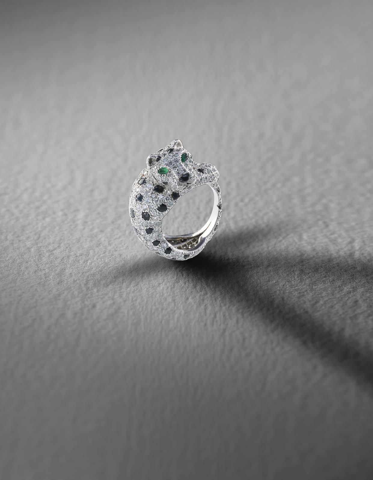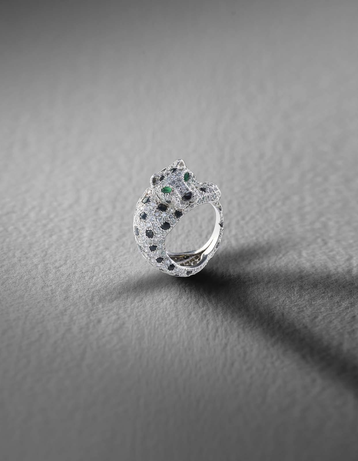 574 CARTIER, A GEMSET PANTHÈRE RING, C1980s, designed as a crouching panther, pavéset with round brilliantcut diamonds and onyx cabochons, its eyes set with pearshaped emeralds, mounted in platinum, signed Cartier, Paris, numbered 128102, stamped Pt950, total approximate diamond weight 2.50cts, size K, case stamped Cartier Paris £20,00030,000