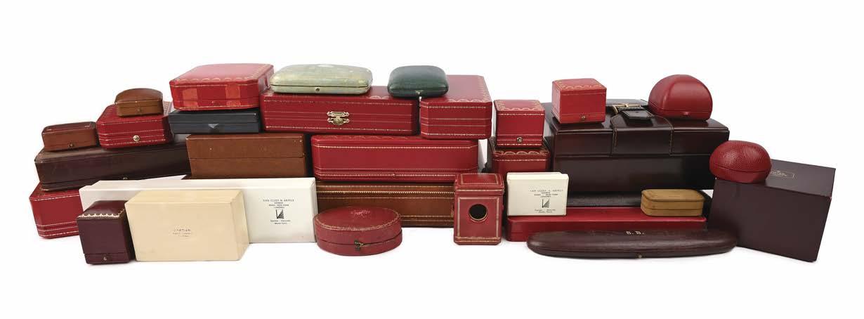 JEWELLERY BOXES, including ten boxes by Van Cleef & Arpels, eleven by Cartier, four by Harry Winston, three by Patek Phillipe, three by Chopard, two by Tiffany & Co., two by Bulgari, two by Piaget, one by Boucheron, together with a quantity of signed pouches and cardboard boxes, and various other jewellery boxes and pouches