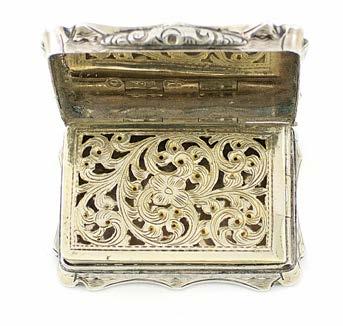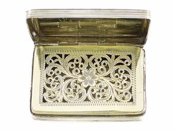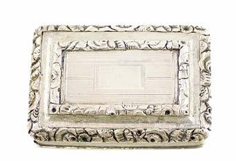 1038 A William IV silver presentation snuff box, by Nathaniel Mills, Birmingham 1834, rectangular form, chased scroll foliate borders with engine-turned decoration, the hinged cover inscribed ‘Frae James Carnegie Esq o’Northesk to the Rev Daniel McAfee as a small token o’ friendship an esteem And as a testimony o’ his social virtues varied talents & sound constitutional an’ religious principles. Cork 14th July 1840.’, with a gilded interior, length 8.8cm, approx. weight 5.6oz. £200-300