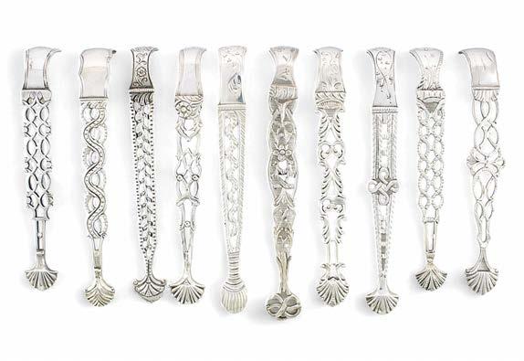 1008 A collection of ten pairs of George III cast silver sugar tongs, various dates and makers, pierced decoration, one with pierced bowls, the others with shell bowls, approx. weight 13.5oz. (10) £250-300