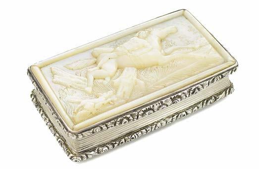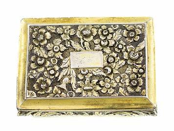1034 A Victorian silver snuff box, by Willmore & Co., Birmingham 1842, rectangular form, chased scroll foliate border and sides, the hinged cover embossed with boys playing instruments in a woodland scene, gilded interior, length 7.6cm, approx. weight 3.6oz. £150-200