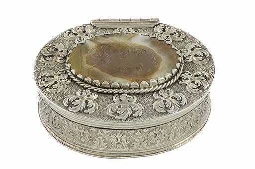 1035 A George III silver snuff box, maker’s mark worn, circa 1800, oval form, the pull-off cover with initials, length 11.5cm, approx. weight 3.3oz. £100-150