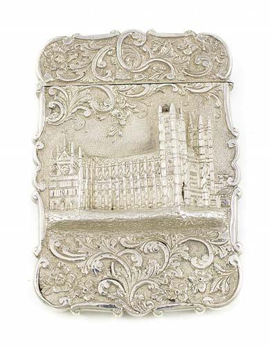 1037 A Victorian silver presentation snuff box, by David Pettifer, Birmingham 1854, rectangular form, modelled scroll border with engraved chased foliate scroll decoration, the hinged cover inscribed ‘Presented to Henry Merriman by a number of his friends as a token of respect. Whitburn 8th Nov 1857’, the bottom inscribed to the cartouche ‘Wm Dunn, Chairman, A.T. Crow, Secretary.’ length 7.7cm, approx. weight 3.9oz. £100-150