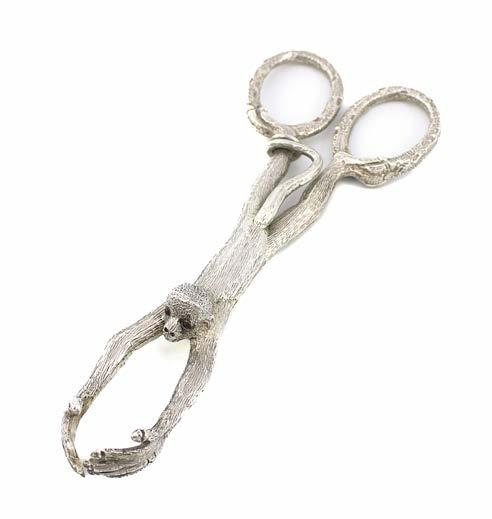 1021 A pair of novelty silver mythical beast sugar tongs, unmarked, the central pivot modelled as a beast’s head, textured arms, the four-fingered bowls, length 10cm, approx. weight 1,7oz. £100-150