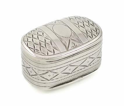 1042 by Samuel Pemberton, Birmingham 1795, oblong form, engraved foliate and geometric decoration, hinged cover, length 7.2cm, approx. weight 1.7oz. £300-400