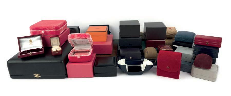 1006 A collection of jewellery boxes, the 38 modern boxes and pouches including examples by Cartier, Asprey, Garrard, Chopard and Theo Fennell, and ring cases by Bulgari and Tiffany & Co. £100150 This lot will be sold without reserve