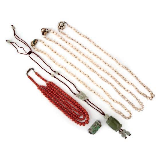 λ 1037 A group of jewels including a coral necklace, comprising: an Art Deco jadeite plaque brooch, length 3.9cm; a nephrite and cord necklace; three cultured pearl necklaces, to gold clasps, one set with emeralds, each stamped 14K; and a multistrand coral bead necklace, the beads measuring 5.910.4mm diameter, length 33.5cm, necklace weighing 62 grams £200300