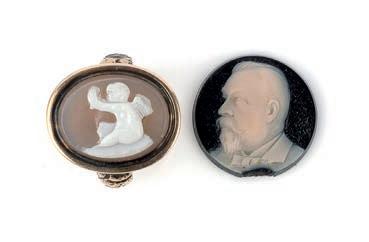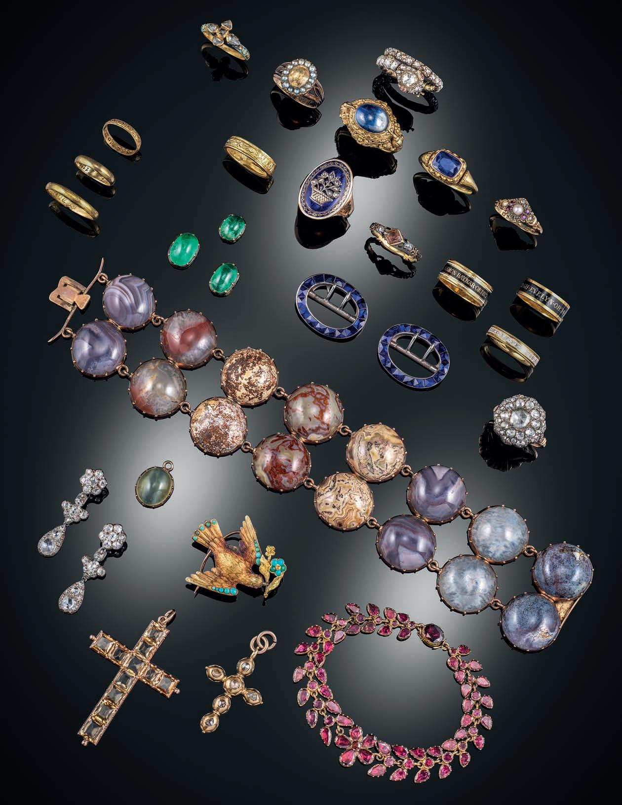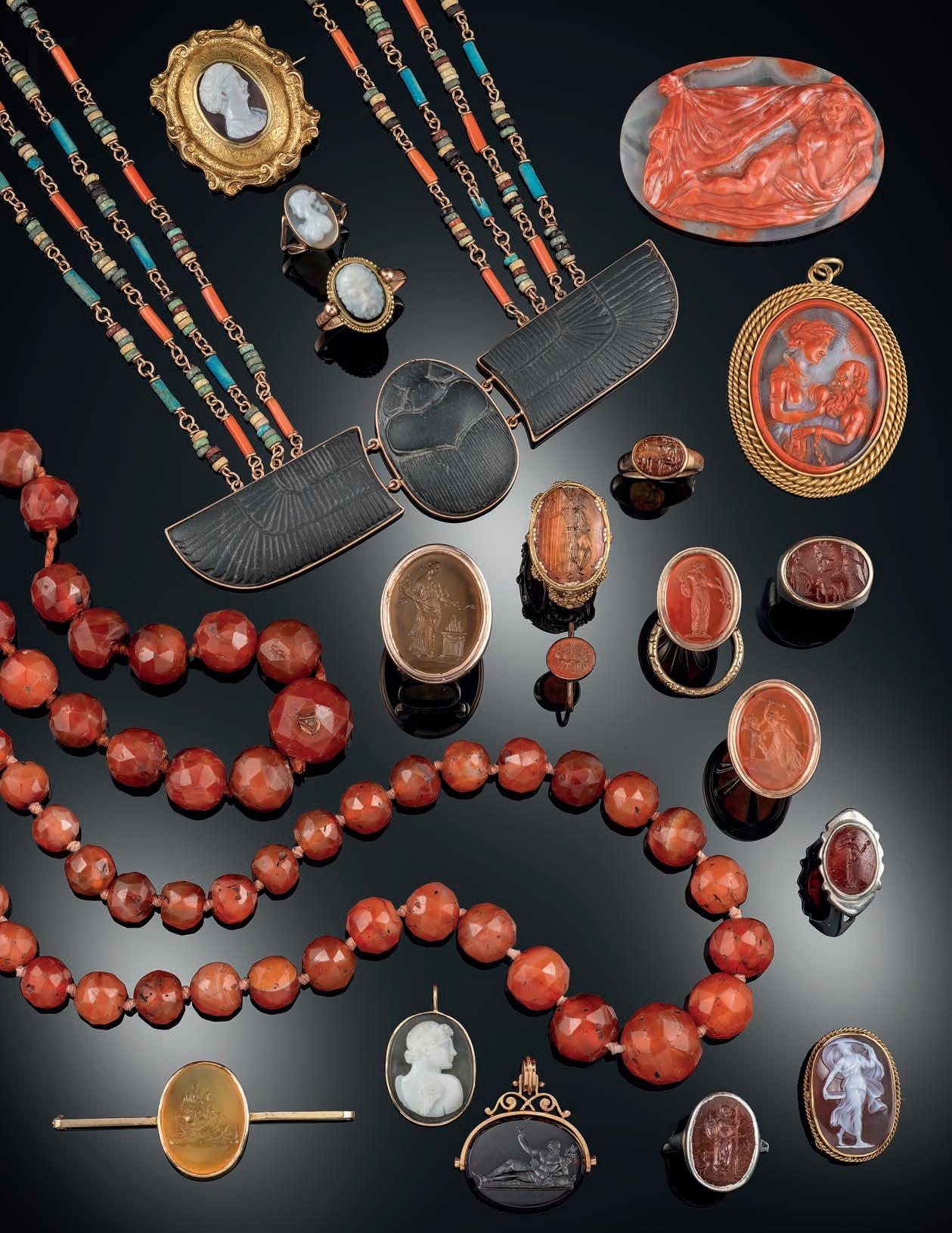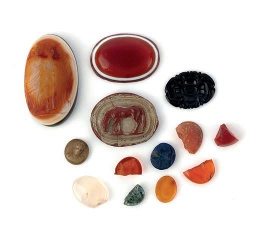 λ 1028 A collection of jewels, 19th century, comprising: a gold ring set with an agate intaglio of an elephant, size L½; a gold and ruby necklace and bracelet, each modelled as snakes, bracelet length 18cm, necklace length 61cm; a carnelian fob seal; a gold signet ring with a glazed compartment of hair, size L½; a square brooch set with a painted picture of a man wearing a feathered hat, mounted in gold, measuring 1.7 x 1.6cm; a pair of lapis lazuli studs; a pair of gilt metal and micromosiac pendent earrings depicting Roman ruins, length 8.6cm; a brooch of radiating design set with lava and coral cameos, mounted in gold, 3.1 x 3.6cm, two gold stick pins, one set with a coral bead, the other with an engraved gold bead, longest 7cm; a small gold buckle applied with red and white enamel; length 1.7cm; a rectangular gold pendant set with rosecut diamonds on a damaged ground of blue enamel, within a border of half seed pearls, length 3.5cm; a 9ct gold carnelian and bloodstone swivelset fob seal, length 4.3cm, British hallmarks; and a twopart gilt metal and bloodstone belt buckle; together with a later gold ring set with a circularcut synthetic ruby, size F £600800