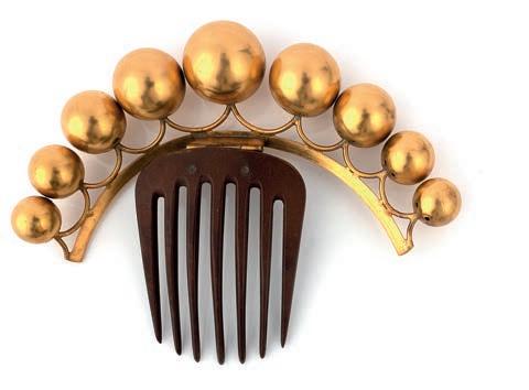λ 1024 A gilt metal and tortoiseshell hair ornament, 19th century, the top designed as a curved band with radiating flameshaped motifs topped with gilt spheres, to a tortoiseshell comb fitting, inner curve 11.5cm £200300