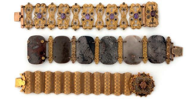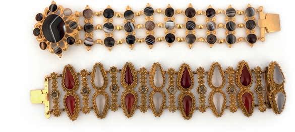 1017 Two gilt metal and hardstone bracelets, mid 19th century, one set with pearshaped cabochons of carnelian and white chalcedony, mounted in gilt metal cannetille settings, length 18cm; the other set with cabochons of banded agate, to gilt metal mounts accented with bead decoration, to a larger agate cluster clasp, length 17.5cm £200300
