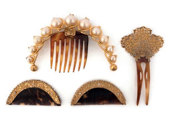 λ 1016 A pair of gilt metal, tortoiseshell and paste haircombs, and two hair ornaments, 19th century, the pair of tortoiseshell combs decorated with gilt filigree and colourless pastes, length 9cm; together with a simulant pearl and gilt metal hair ornament with tortoiseshell comb, inner curve 18cm; and a gilt metal hairpin of scrolled design with a tortoiseshell fitting, length 12.5cm £200300
