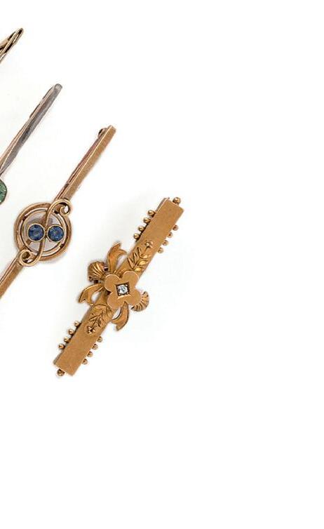 1031 A mixed group of jewellery, comprising: five gold bar brooches, late 19th/early 20th century, variously set with pearls, diamonds, sapphires and a green paste stone, longest 5.6cm, pearls untested, three fitted cases; a late 19th century gold and diamond brooch modelled as a flower, diameter 2.3cm; a pair of gold cufflinks; a 19th century rosecut garnet locket brooch, 4.8 x 4.0cm; a pair of gold, cultured pearl and sapphire ear clips, length 2.2cm each; and a gilt metal brooch/turban ornament set with rubies, length 10.5cm £200300