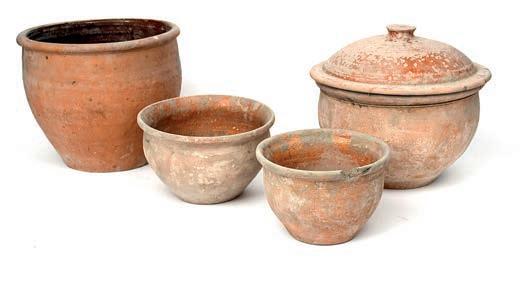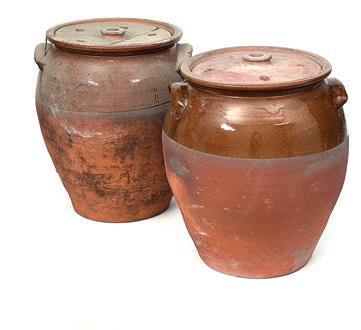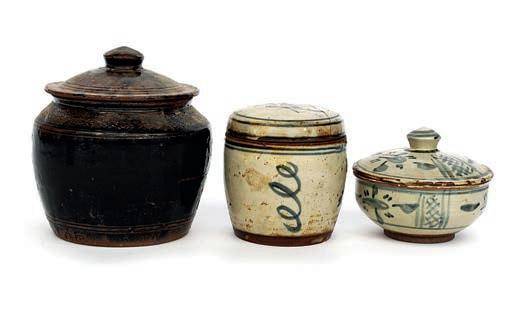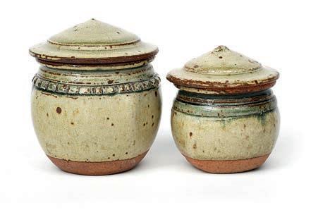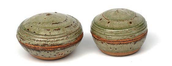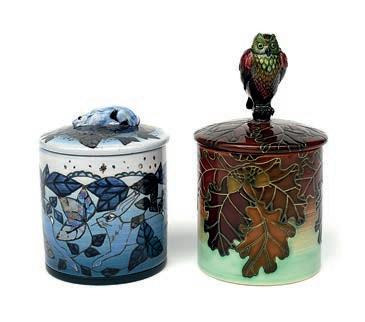 ‘Forest Glen’ a Clarice Cliff small Beehive Preserve pot and cover, painted in colours, and a Clarice Cliff ‘Forest Glen’ Bon Jour preserve pot and cover, printed factory marks 7cm. high (4)