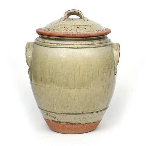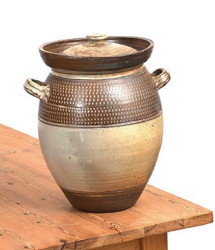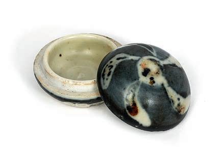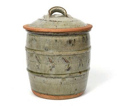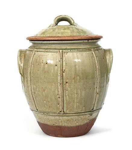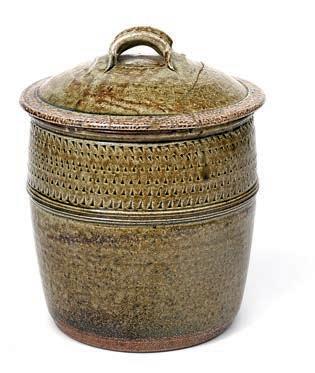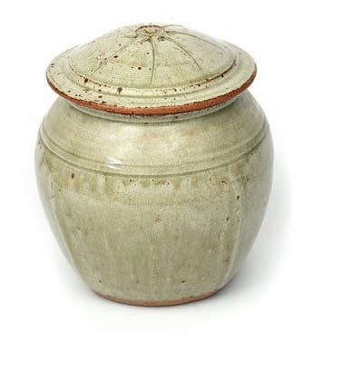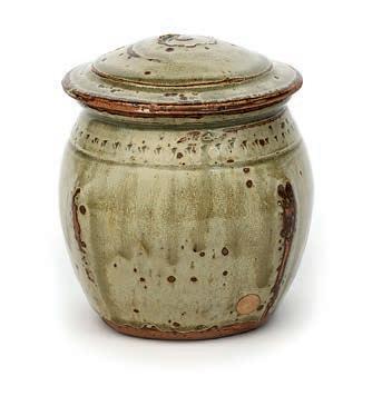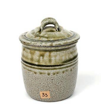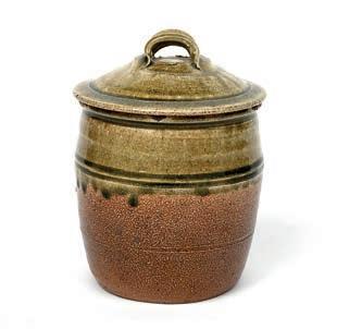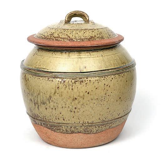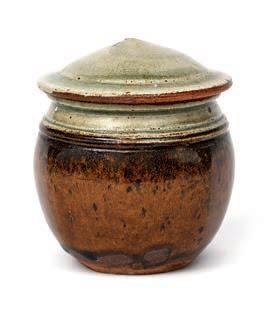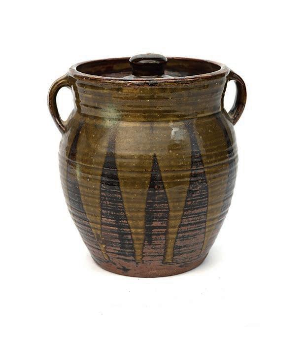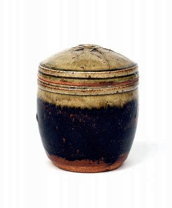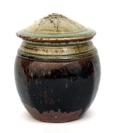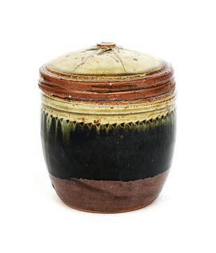 ‘Honolulu’ a Clarice Cliff Bizarre Bon Jour preserve pot and cover, painted in colours, the cover with green and black bands, printed factory mark, repaired crack to pot 10cm. high