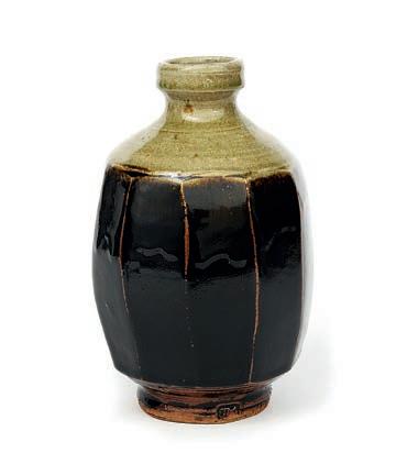 ‘Double V’ an unusual Clarice Cliff Bizarre vase, shape no.13, painted in colours inside brown and black bands, printed factory marks, hairline crack, 22cm. high