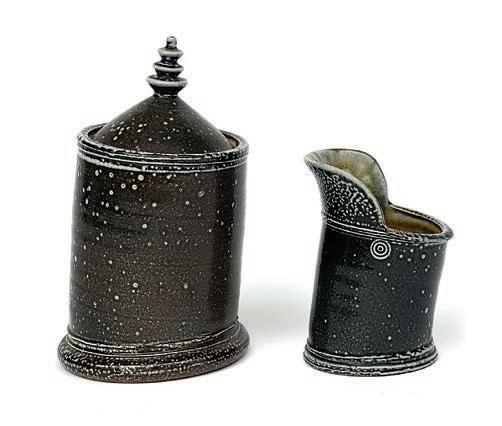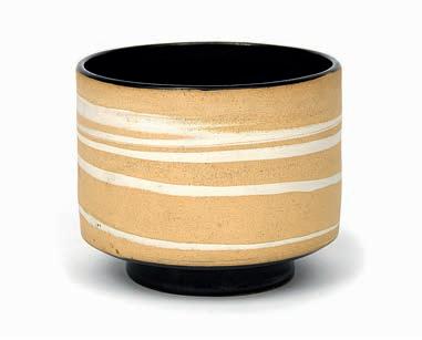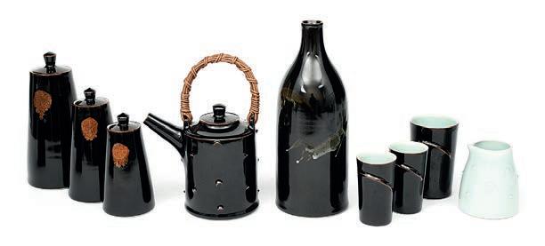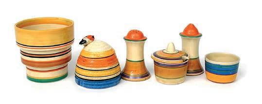 ‘Liberty’ a Clarice Cliff Bizarre fern pot, shape no.416, painted with thin bands, a Clarice Cliff ‘Liberty’ small Beehive preserve pot and cover, a cruet set and a small mustard pot, printed factory mark, 8.5cm. high (8)