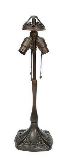 A Clarice Cliff lamp base, ovoid cast in low relief in stylised flowers, glazed in colours on a mushroom ground, and a Royal Cauldron pottery twinhandled lamp base printed factory mark, 16cm. high (2)