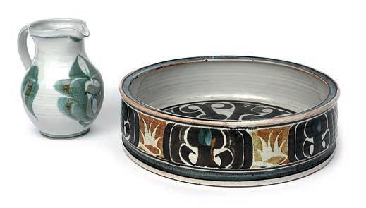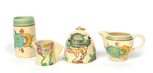 ‘Viscaria’ a Clarice Cliff Beehive preserve pot and cover, painted in colours, a ‘Viscaria’ Conical milkjug and a vase and jug similar, printed factory marks, 9.5cm. high (5)