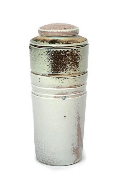 ‘Honolulu’ a Clarice Cliff Bizarre Cylindrical preserve pot and cover, shape no.3, painted in colours printed factory marks, 9.5cm. high (2)