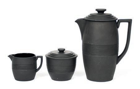 A Clarice Cliff Bon Jour coffee set, painted with green, pink and brown bands, comprising; coffee pot and cover, milkjug and sugar basin, five Conical cups and six saucers, printed factory marks, 18cm. high (15)