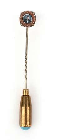28 A collection of seven stick pins, early 20th century, comprising: one with a sycamore leaf in green enamel with the initials AIBES in reserve; one with a painted miniature of a lady; one with a black pearl;one with a rabbit finial; one with a blindfolded lady; one modelled as a spider with a pearl abdomen, a sapphire thorax and rose cut diamond eyes; all mounted in gold, together with one gilt metal military stick pin, longest 7.5cm, pearls untested £200 300