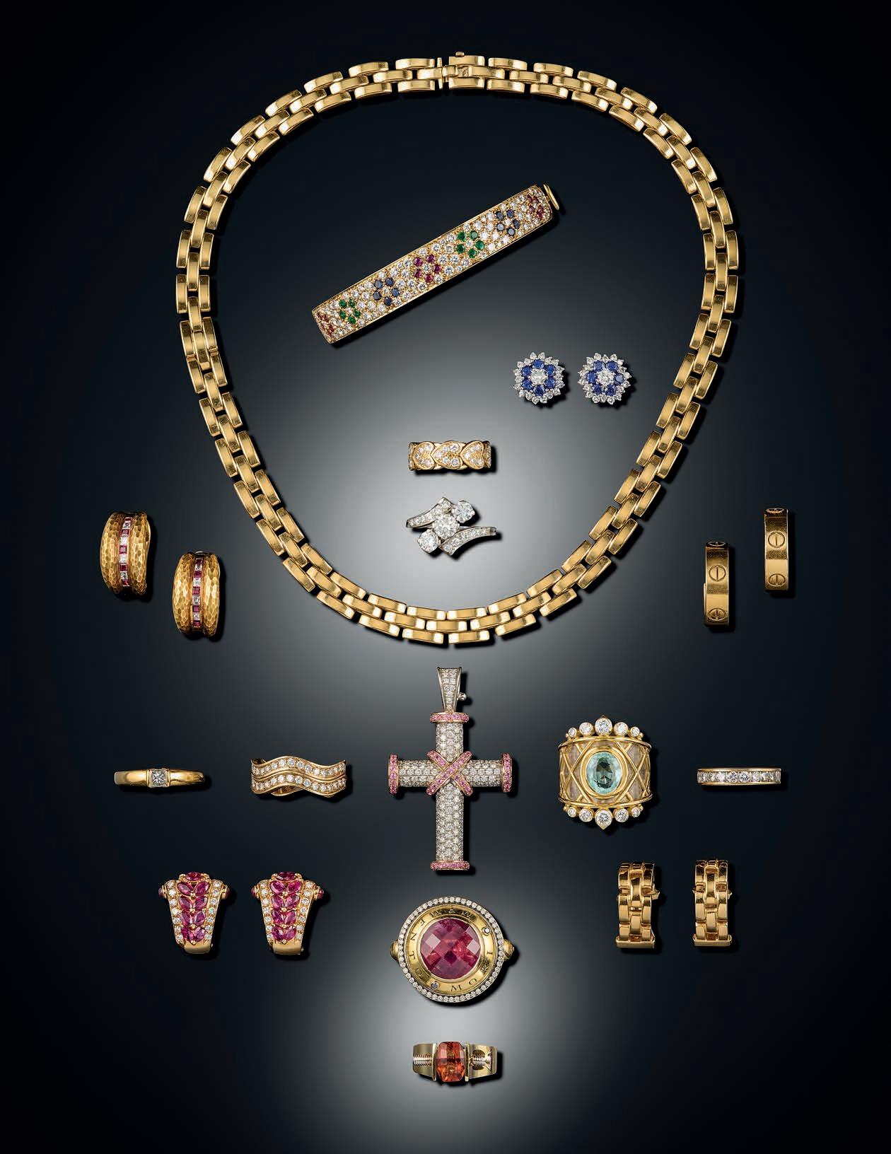 11 A large collection of jewellery, comprising: a gold chain necklace suspending a trio of pendants set with circular cut rock crystal, citrine and smoky quartz respectively, accented with brilliant cut diamonds, Italian maker’s mark, stamped 750; a white gold, jadeite and diamond bangle, stamped 18K; a turquoise, garnet, coral and diamond demi parure in white gold; a cultured pearl pendant on a black rubber cord necklace; a white gold ring of bombé design set with rose cut rock crystal; a white chalcedony and rock crystal bead bracelet; a silver chain and cultured pearl bracelet and necklace by Elsa Peretti for Tiffany & Co., each signed Peretti, Tiffany & Co.; a large amber pendant; a large blue topaz inscribed with gilded Arabic calligraphy in a gold brooch, stamped 22K and 18K; a filigree ‘Hand of Fatima’ pendant centring on an enamel and diamond ‘Evil Eye’, on a cord necklace; three cultured pearl necklaces and two cultured pearl bracelets; three silver bangles by Yves Saint Laurent, each signed Saint Laurent; a pair of silver, peridot and diamond torque bangles; a mesh link bracelet with an Arabic calligraphy slide set with brilliant cut diamonds; a sapphire and emerald ‘HH’ initial brooch; a simulant stone bee brooch by Dior, signed Christian Dior; a navette shaped turquoise, amethyst and diamond pendant; a torque bangle set with rose cut sapphires and single cut diamonds; a gilt silver and cord bangle; a simulant diamond ring and a silver and coral sea urchin and starfish motif ring; a diamond pendant on a white gold pendant; a pair of silver bulldog cufflinks by Dunhill, signed Dunhill; a calibré cut emerald and chain bracelet, one emerald deficient; a green chalcedony and onyx bracelet; an antique pair of citrine and paste earrings; a pair of carved conch shell and cultured pearl stud earrings; a cultured pearl pendant; a rose quartz pendant; an amethyst ring, a turquoise and diamond ring, and an amethyst, turquoise and diamond ring; thirteen pendant necklaces including larimar and diamond pendants; five bracelets; a spectacle set black diamond chain necklace; a pair of earrings set with rose cut diamonds; two chain necklaces, a gilt metal necklace, an enamel football pin badge, a Dior velvet and paste choker necklace; a collection of costume jewellery including matching necklace and earrings, a pair of ear clips, a brooch and a pair of simulant pearl earrings; a pair of silver filigree, green chalcedony and cultured pearl earrings; a wire work ring set with brilliant cut diamonds; and a base metal magnetic bracelet with a green leather strap £300 400