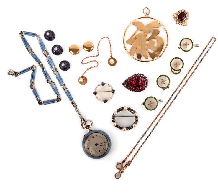 25 A collection of jewels, comprising: a silver and blue guilloché enamelled fob watch necklace, circa 1900, watch length 4.3cm, chain length 54cm, Swiss assay and British import hallmarks for silver; numbered 197212; a late 18th/early 19th century pear shaped brooch set with foil backed garnets, length 2.8cm, later brooch fitting; a star sapphire and half pearl cluster ring, size N½; an Edwardian brooch designed as a ring of seed pearls and circular cut sapphire, numbered 47217, fitted case stamped C Sewell; a silver, cultured pearl and marcasite laurel wreath brooch; a garnet and half pearl cluster ring, size O, stamped 14K; a bicoloured 18ct gold rope twist watch chain, length 35cm; a gold medallion pendant with the Chinese character fu for good fortune, length 5cm; four enamel, mother of pearl and seed pearl buttons, each stamped 18K; three enamel and half pearl shirt studs; a pair of gilt metal and cultured pearl collar studs; and an additional pair of plain gold collar studs, each stamped 18, together with three cases, pearls untested £300 500