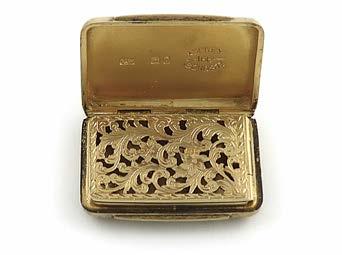 1500 A George IV 18-carat three-colour gold vinaigrette, by Charles Rawlings, London 1824, rectangular form, engine-turned decoration, the hinged colour applied with a threecolour gold border, the interior with a hinged pierced foliate scroll grille with a squirrel eating a nut, length 3.4cm, approx. weight 20.4g. £1,000-1,500