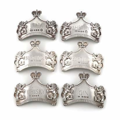 1539 By Leslie Durbin, a matched set of six modern Queen’s Coronation silver wine labels, London 1953, shaped rectangular form, with lion supports and crown finials inscribed ‘Whisky’, ‘Sherry’, ‘Burgundy’ (x2), ‘Gin’, and ‘Port’, length 6.3cm, approx. weight 6oz. (6) £300-400