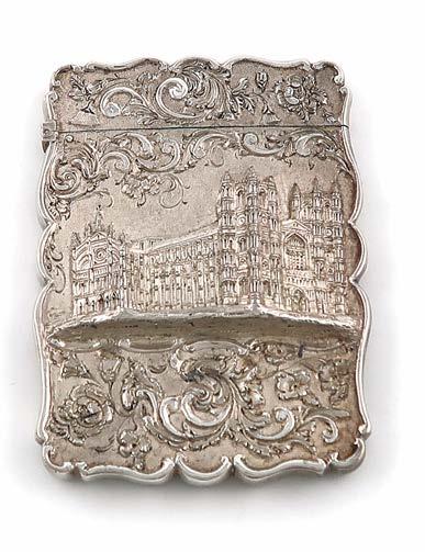 1519 A Victorian silver ‘castle-top’ vinaigrette, Lichfield Cathedral, by Joseph Willmore, Birmingham 1843, rectangular form, the hinged cover with a scene of the cathedral, engine-turned sides and base, foliate borders, with a vacant cartouche, the interior with a pierced and engraved silver-gilt urn and foliate scroll grille, length 4.2cm, approx. weight 1.1oz. £1,000-1,500