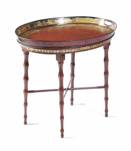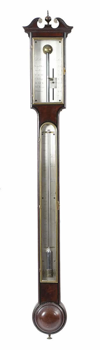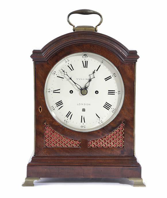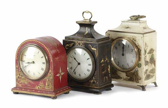 the brass eight day movement with five turned and finned pillars with an anchor escapement striking on a bell, the 12 inch arched dial with a silvered chapter ring with Roman and Arabic numerals, the centre with a subsidiary seconds dial and date aperture with gilt brass spandrels, the arch with a signature panel ‘Tho Bell, London’, in a scarlet lacquer case decorated in gilt with chinoiserie scenes of pagodas and horses, the hood with turned finials and an eagle surmount