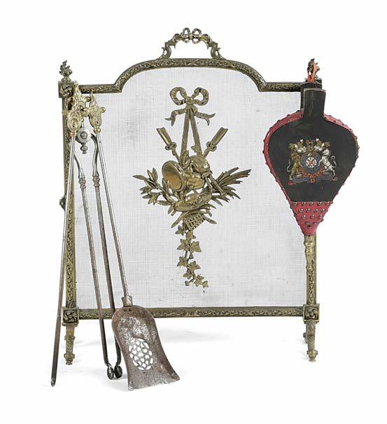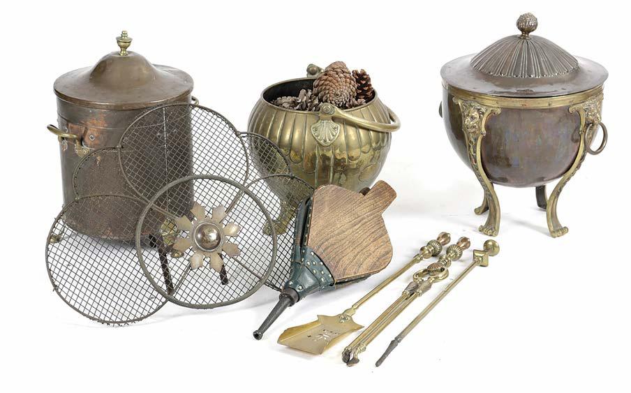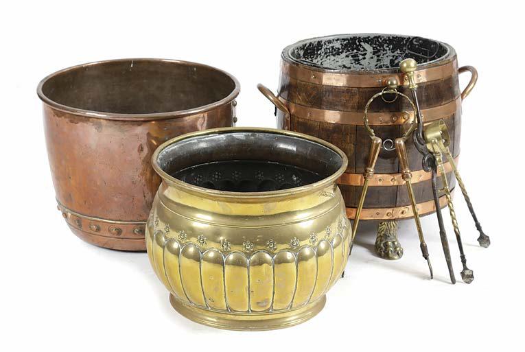 with lobed and flower decoration, together with a copper logbin, a copper and oak coopered example and three fire irons (6) 50cm high (max)