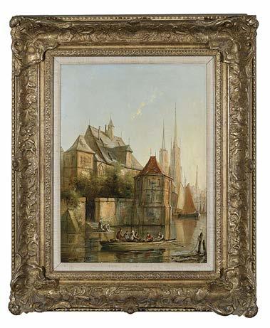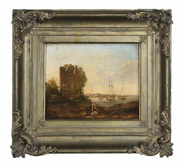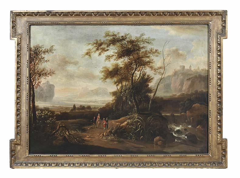 Extensive river landscape with travellers halting on a road Oil on canvas