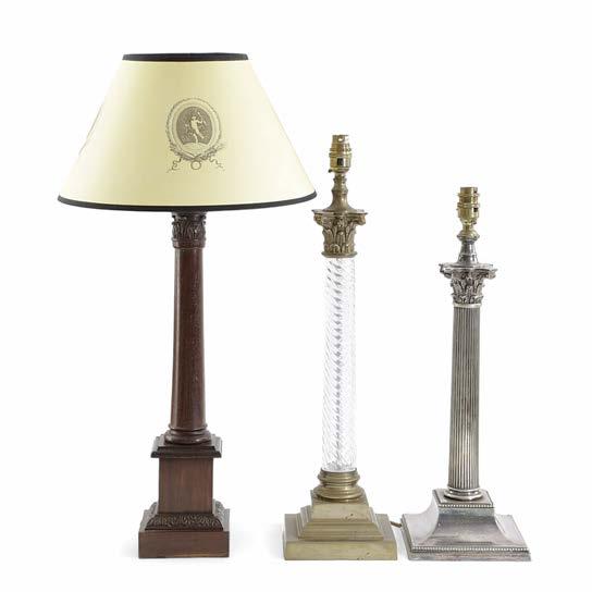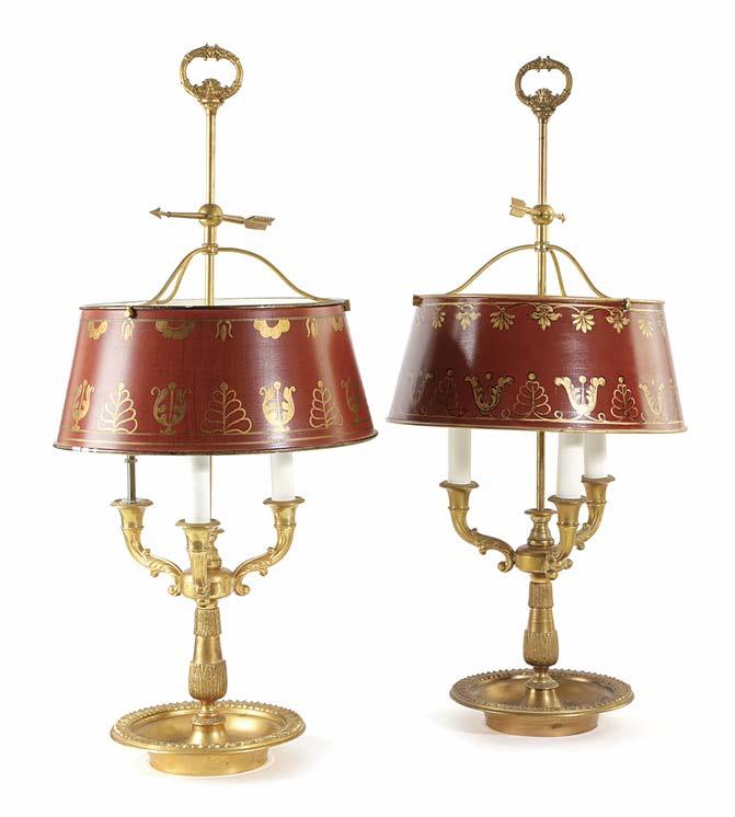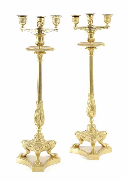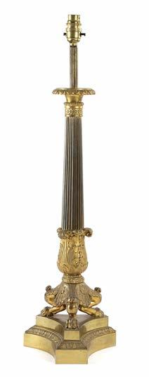 A GILT BRONZE TABLE LAMP IN EMPIRE STYLE, 19TH CENTURY with a reeded stem above acanthus leaves on tripod monopodia supports and a stepped base, with shade, fitted for electricity (2) 53.5cm high