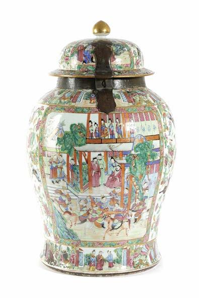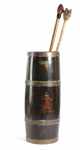 painted with figures in landscape settings, the lid with a copper hinged locking collar 60cm high