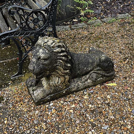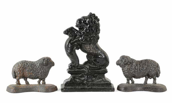 in the form of a rampant lion with his paw resting on a scroll, together with a pair of cast iron sheep (3) 36.4cm high (max)