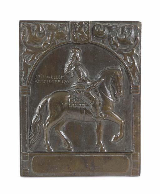 the rectangular plate within a ribbon decorated moulded frame with a cherub surmount holding war trophies and supporting floral swags