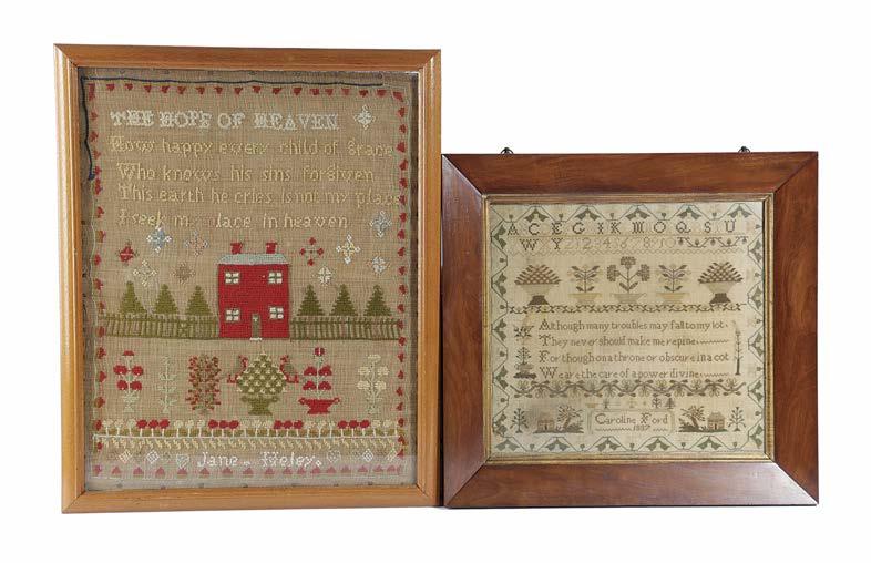 worked with an alphabet, numbers, urns of flowers, a verse and two houses in a glazed mahogany frame, together with a Victorian woolwork sampler by Jane Heley (2)