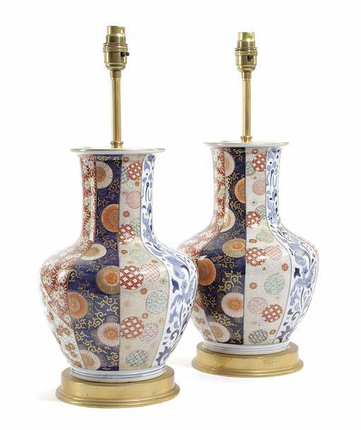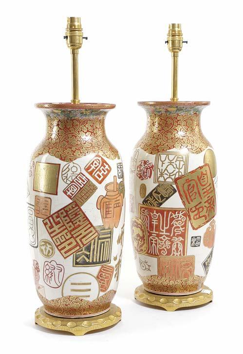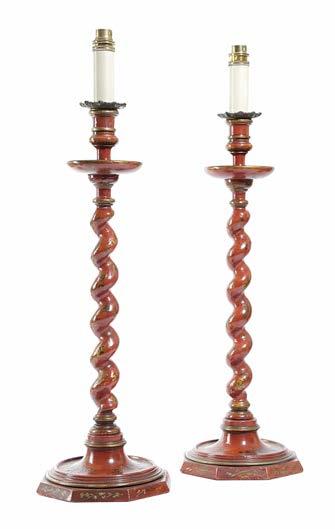 A PAIR OF RED JAPANNED CANDLESTICK TABLE LAMPS IN QUEEN ANNE STYLE, LATE 19TH CENTURY each decorated in gilt with flowers, leaves and a Chinese pavilion, with a spiral twist stem and an octagonal foot (2) 54.5cm high (excluding fittings)