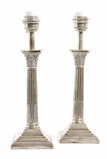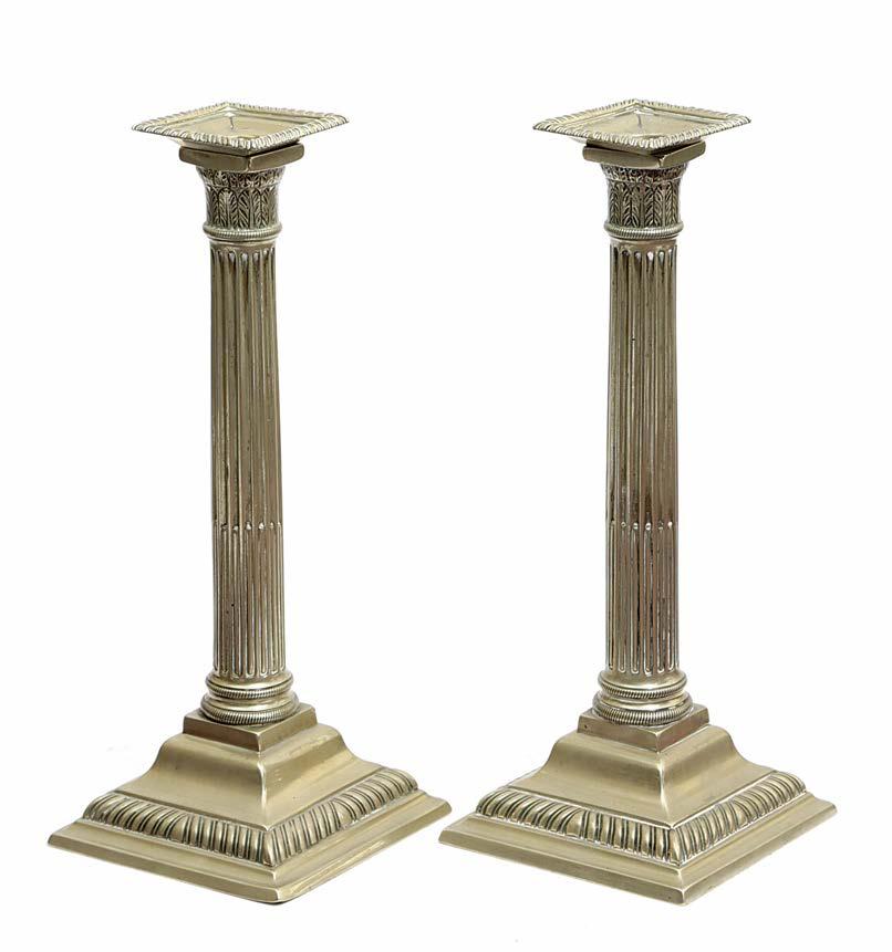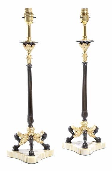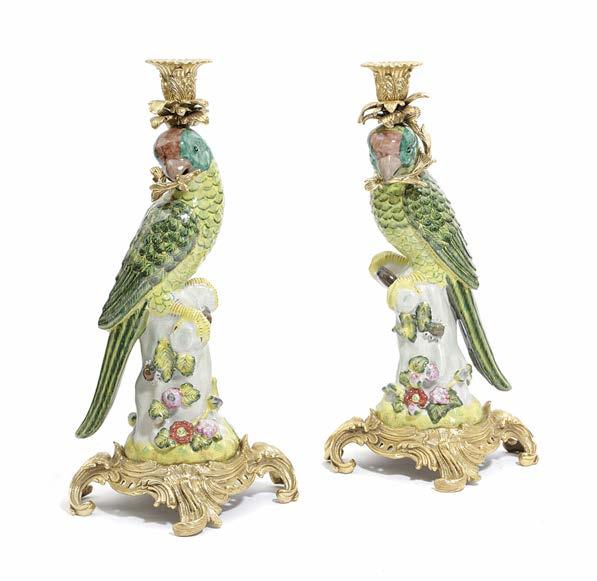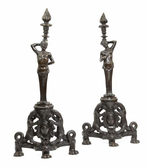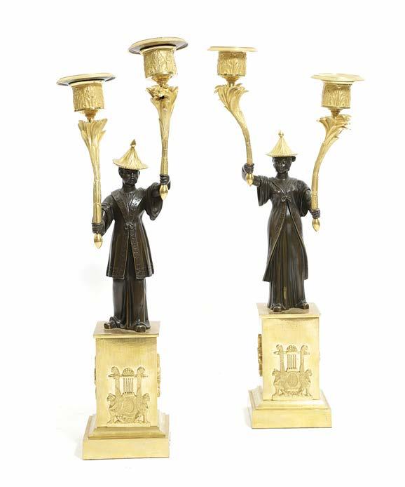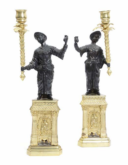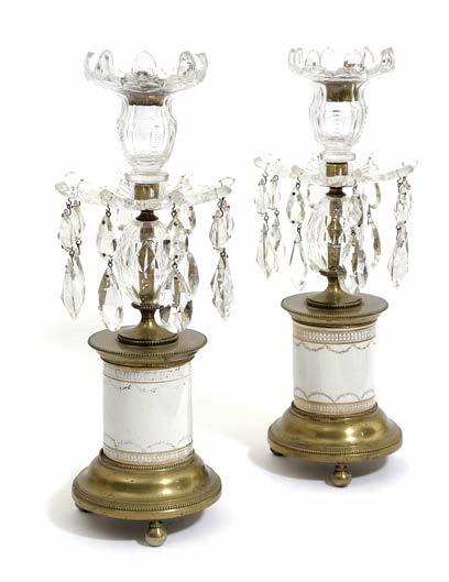 with van dyke style sconces and stellar drip trays, on gilt decorated waisted pedestals and quatrepartite bases with ball feet (2) 29cm high